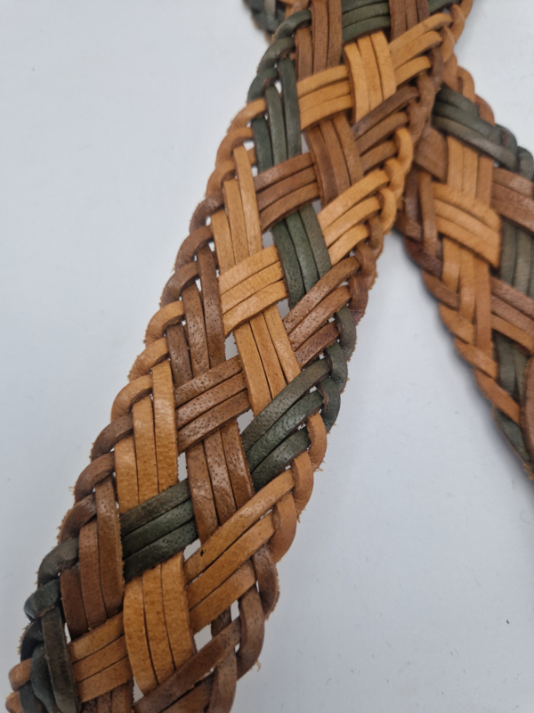 Gevlochten leren riem. 90 cm. Bruin/groen.