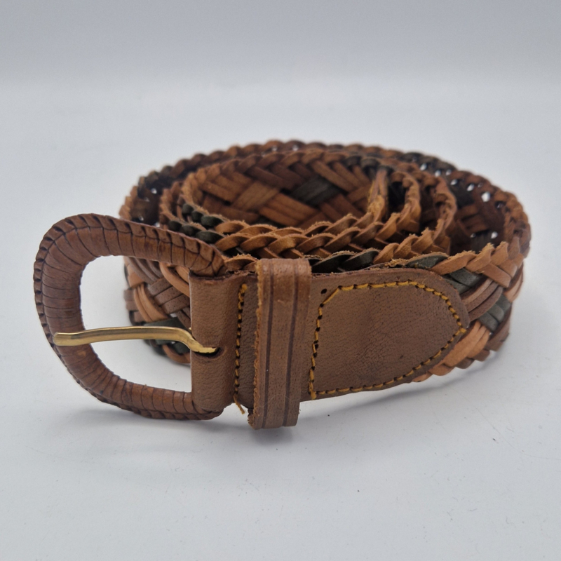 -Mooie bruin/groen gevlochten riem. Deze riem valt mooi bij maat 36 en 38.