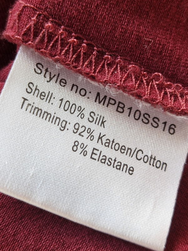 Materiaal: Stof 1: 100% zijde. Stof 2: 92% katoen, 8% elastaan