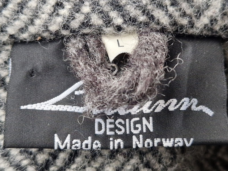 -Uniek handgemaakt wollen jasje met een prachtig ingeweven visgraat patroon van het Noorse knitwear label Lillunn in maat L. Het jasje valt als een maat 40/42.