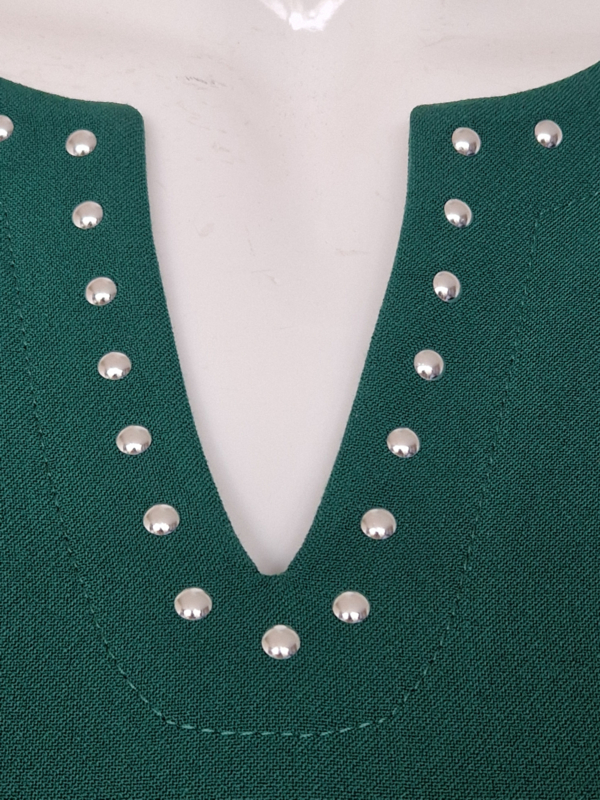 -De jurk heeft een V-hals met zilverkleurige studs, 3/4-mouwen en twee opvallende zakken met studs.