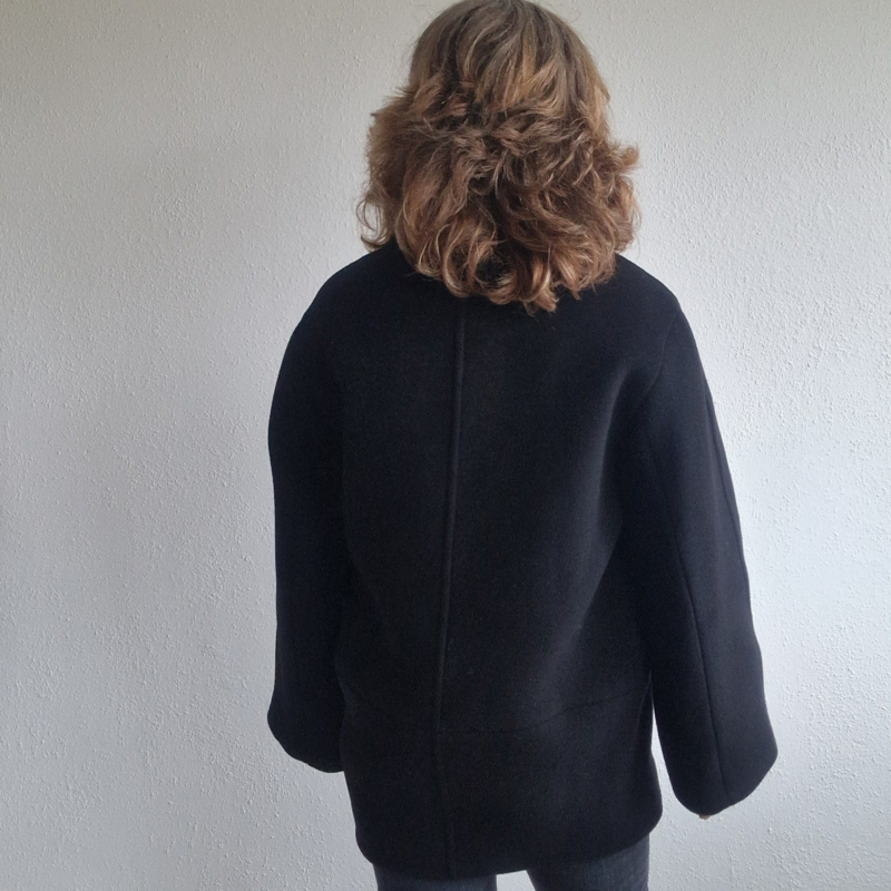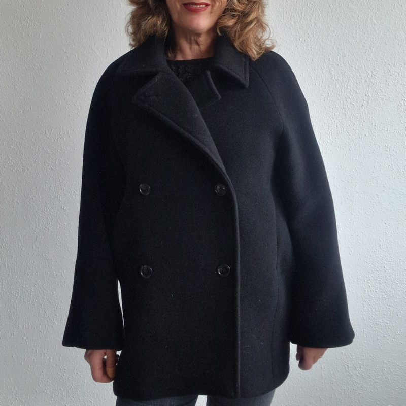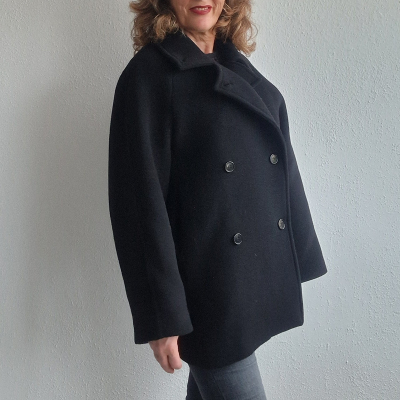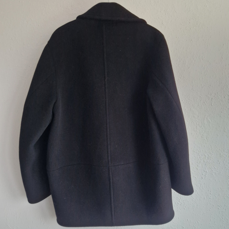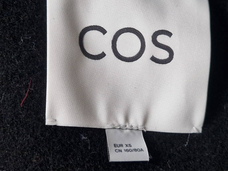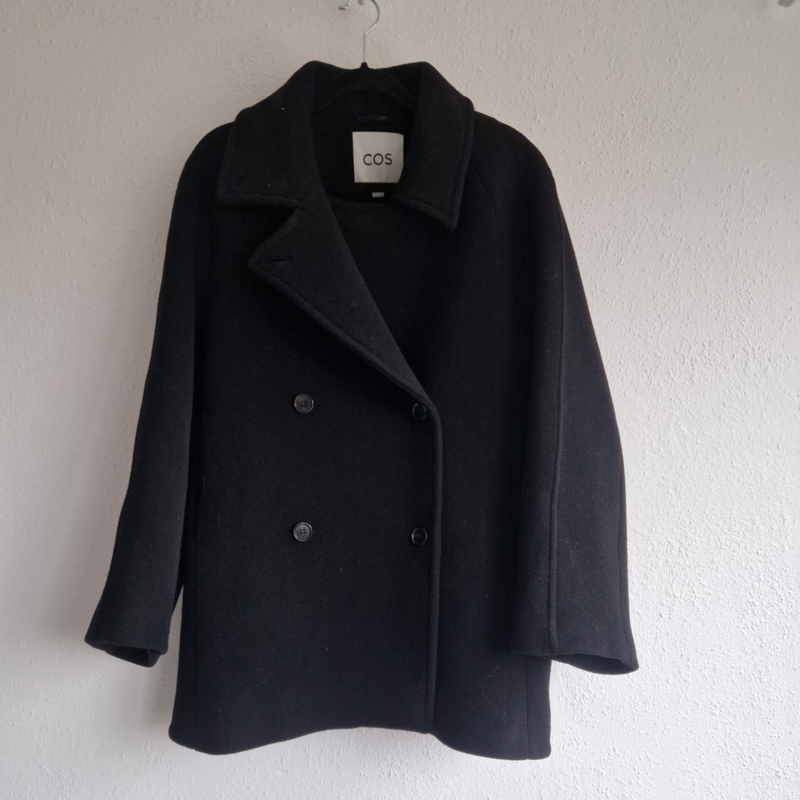 -Tijdloze zwarte wollen double breasted jas van COS in maat XS. Deze jas valt zeer ruim bij maat XS. Kan prima gedragen worden met maat 38 en maat 40.