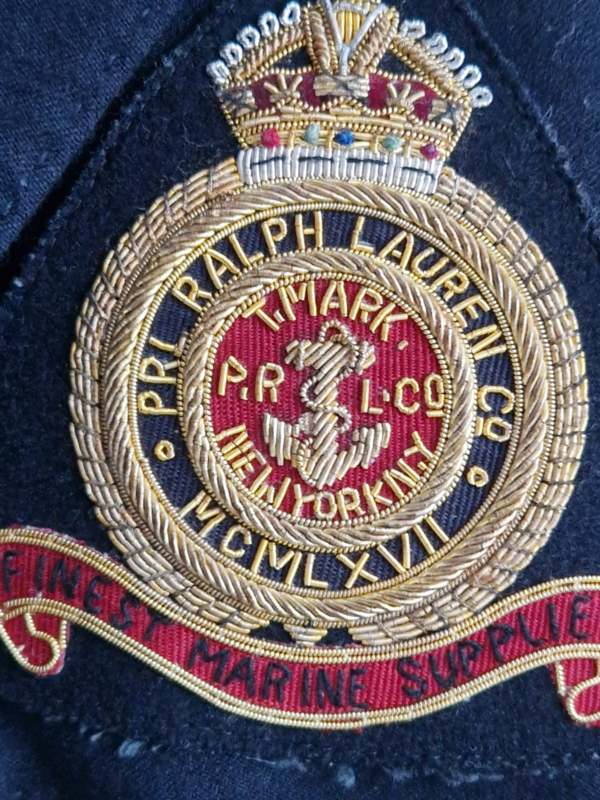 -Geborduurd borst-embleem met tekst “PRL Ralph Lauren – New York”.