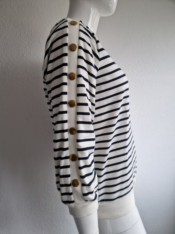 -Dit model heeft driekwart mouwen en opvallende goudkleurige knopen op de schouders voor een subtiel maritiem accent.