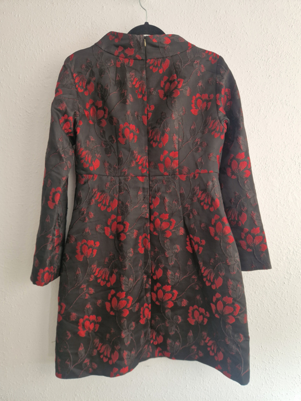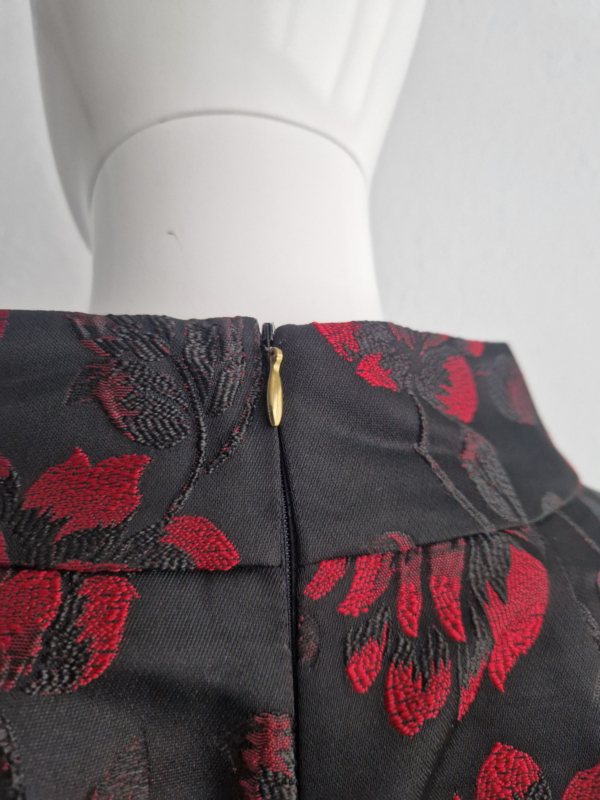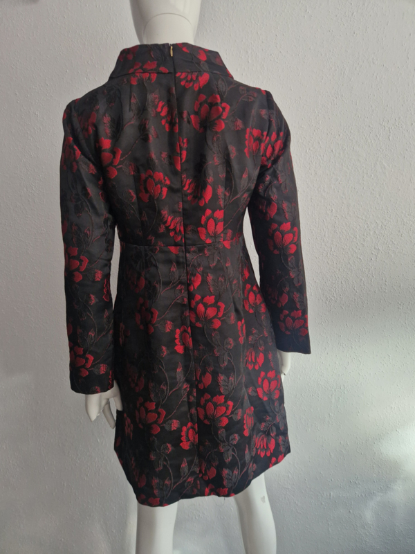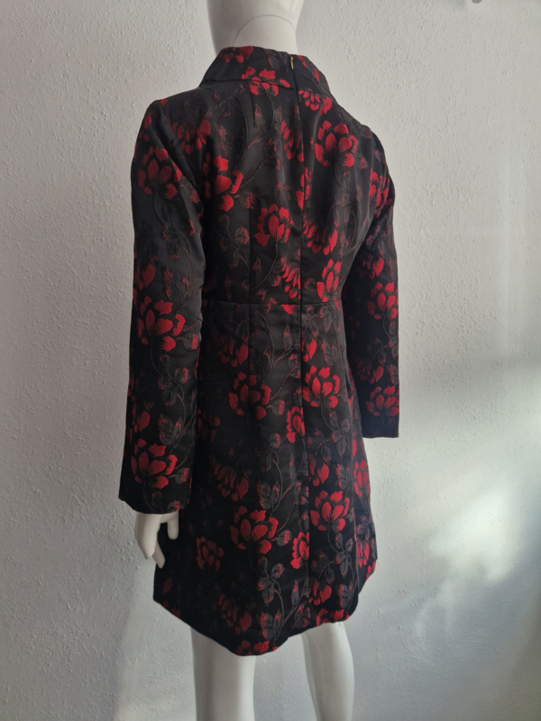 -Deze jurk is uitgevoerd in een luxe zwart geweven stof met rood bloemmotief (jacquard), wat zorgt voor een subtiele glans en een rijke uitstraling.