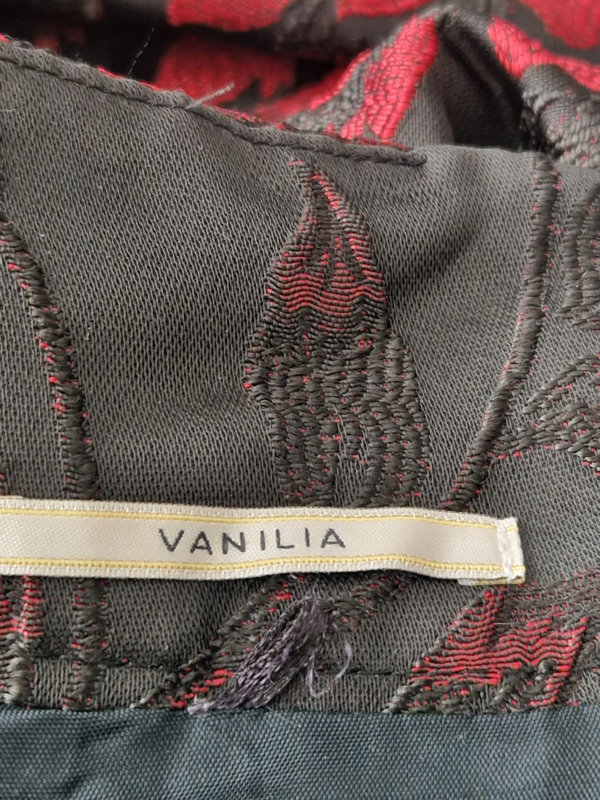 Vanilia jurk. Maat 38, Zwart/rood jacquard bloemmotief