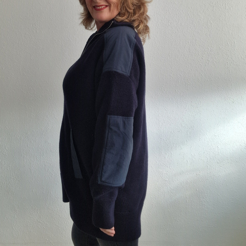 -De schouder- en elleboogstukken zijn uitgevoerd in een gladde, contrasterende stof.
