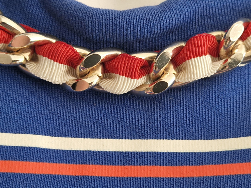 -Het luxe kettingdetail langs de hals in goudkleur met rood/wit lint is een ware eyecatcher.