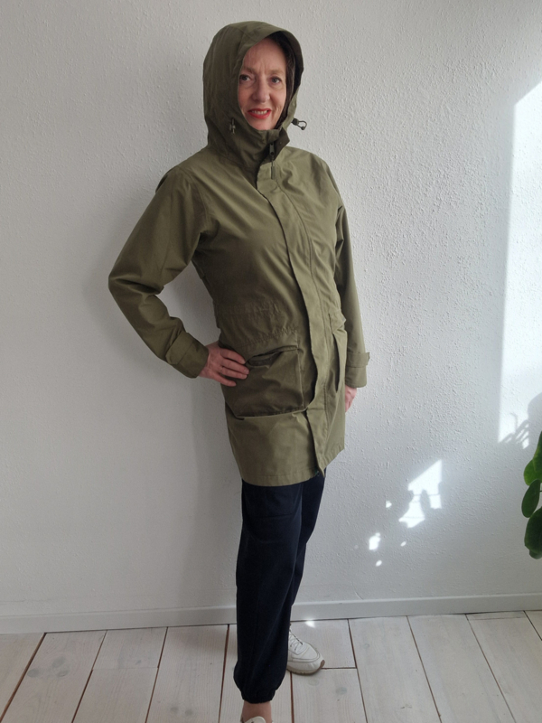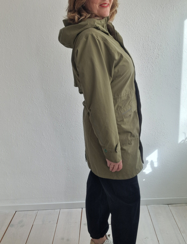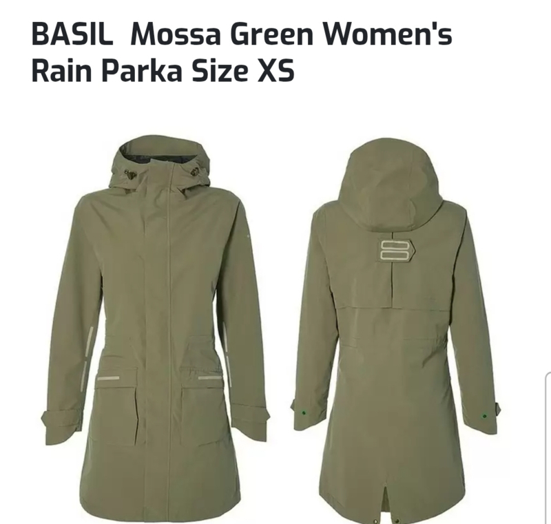 -Stijlvolle Basil Mosse bicycle rain parka voor dames in een mooie olijfgroene kleur in maat M. Kan gedragen worden met een maat 38/40.