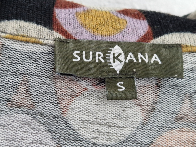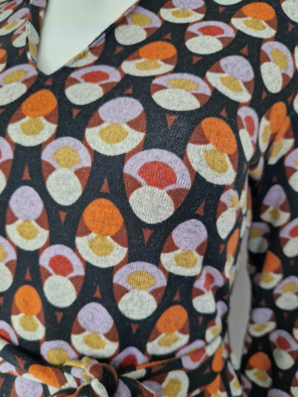 -Prachtige jurk van het Spaanse merk Surkana met een opvallende retro grafische print in warme tinten zoals oranje, crème, lila en bruin. De jurk valt als een maat 36/38.