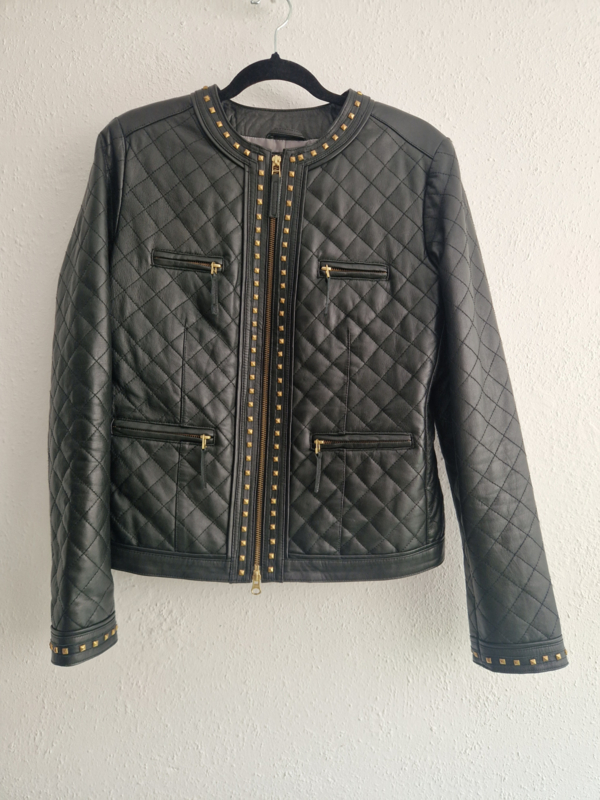 -Dit jasje heeft een luxe uitstraling door het doorgestikte (quilted) patroon en de goudkleurige studs langs de rits en hals.