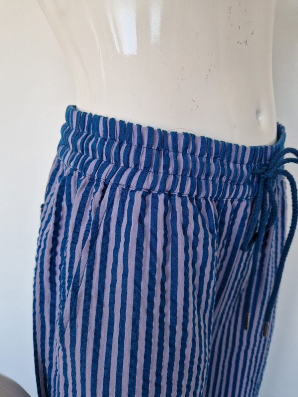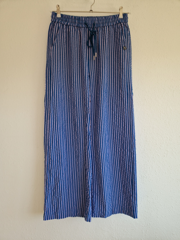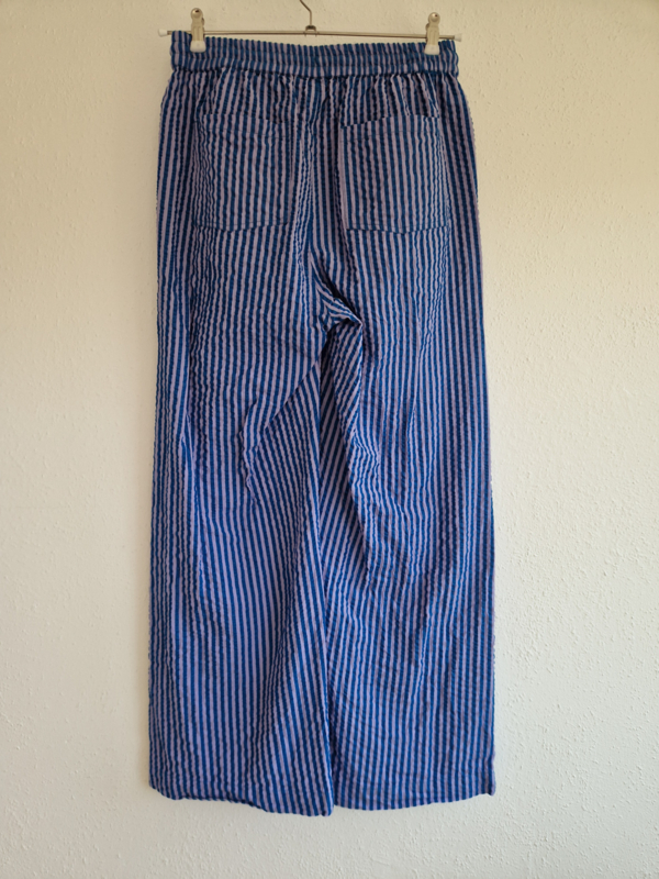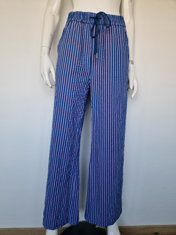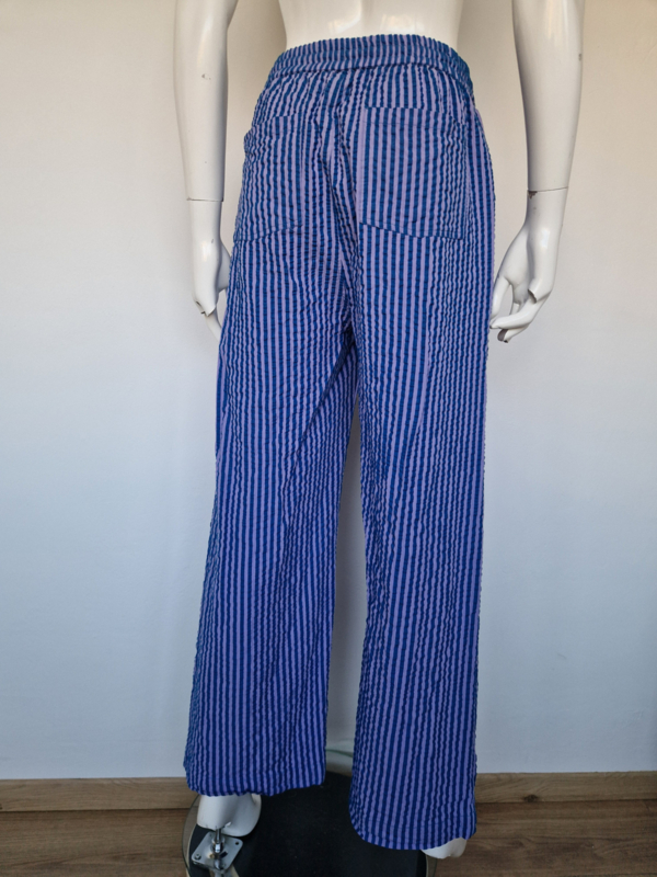 -De broek heeft een speels streeppatroon in blauw en lila en een luchtige, rechte/wide leg pasvorm.
