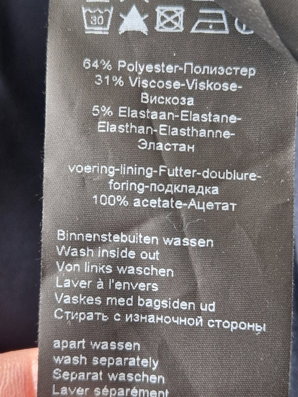 Materiaal: 64% polyester, 31% viscose, 5% elastaan