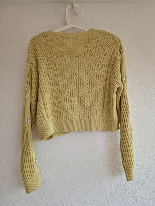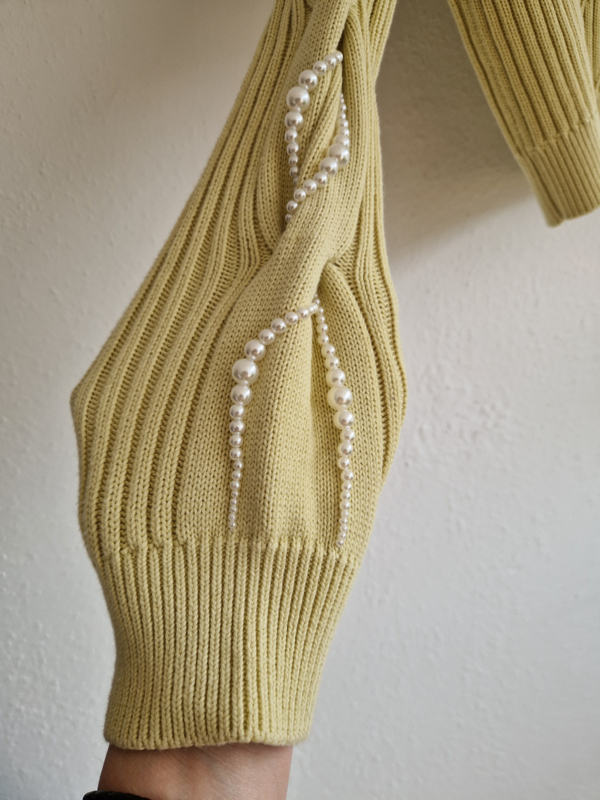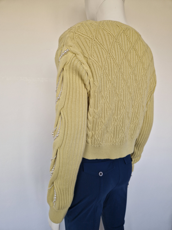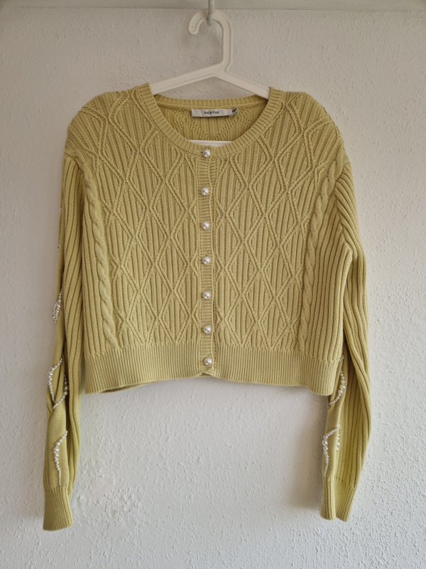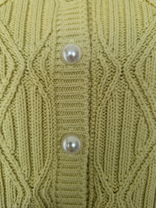 -Dit model (PearlyGZ cardigan) heeft een speels kabelpatroon en luxe parelknopen. Daarnaast unieke pareldetails langs de mouwen.