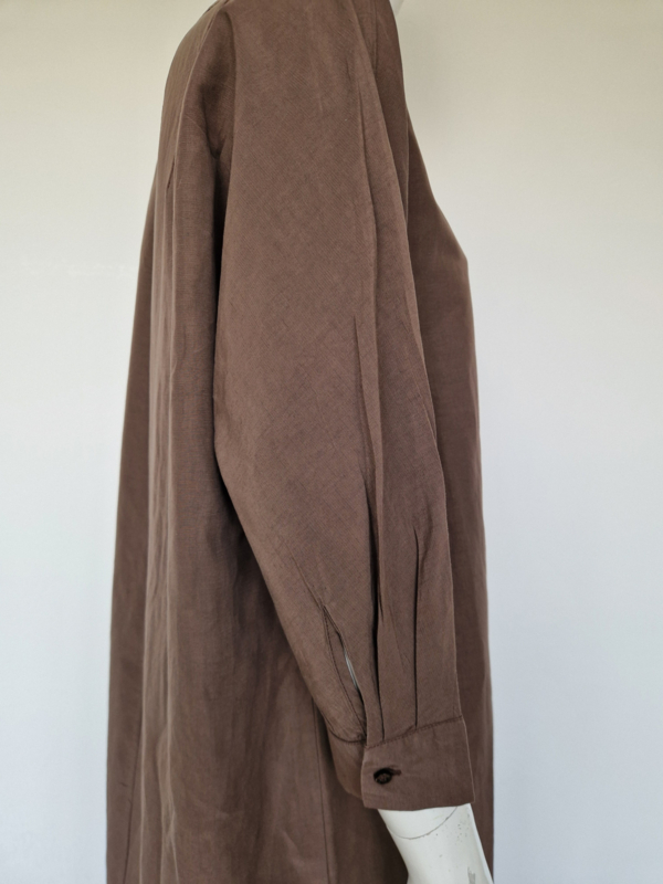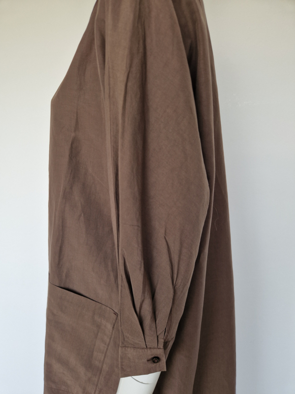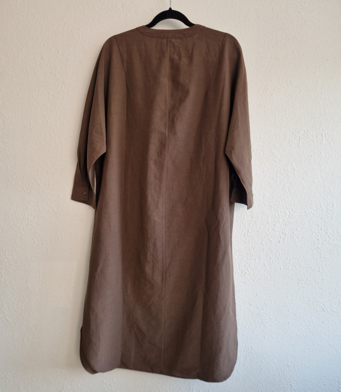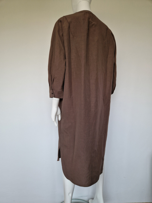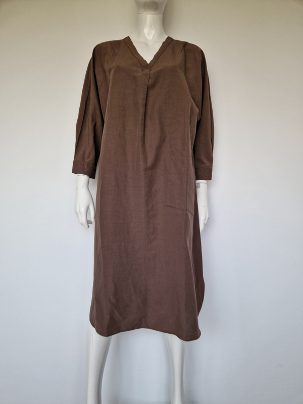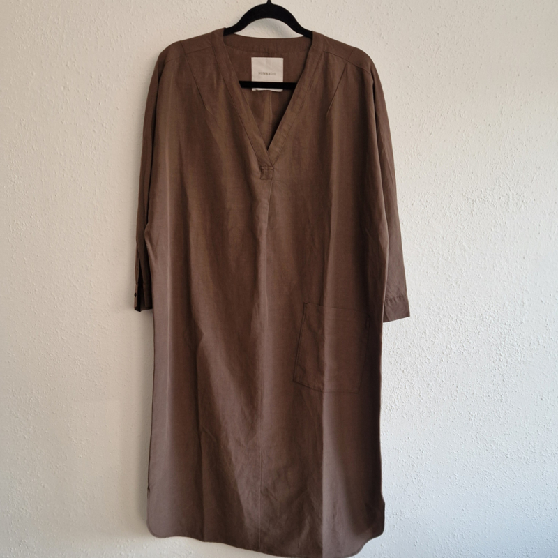 -Prachtige minimalistische jurk met V-hals van het Arnhemse modelabel Humanoid in een mooie bruin tint. De jurk valt oversized bij maat S. Kan prima gedragen worden met maat 38 en 40.