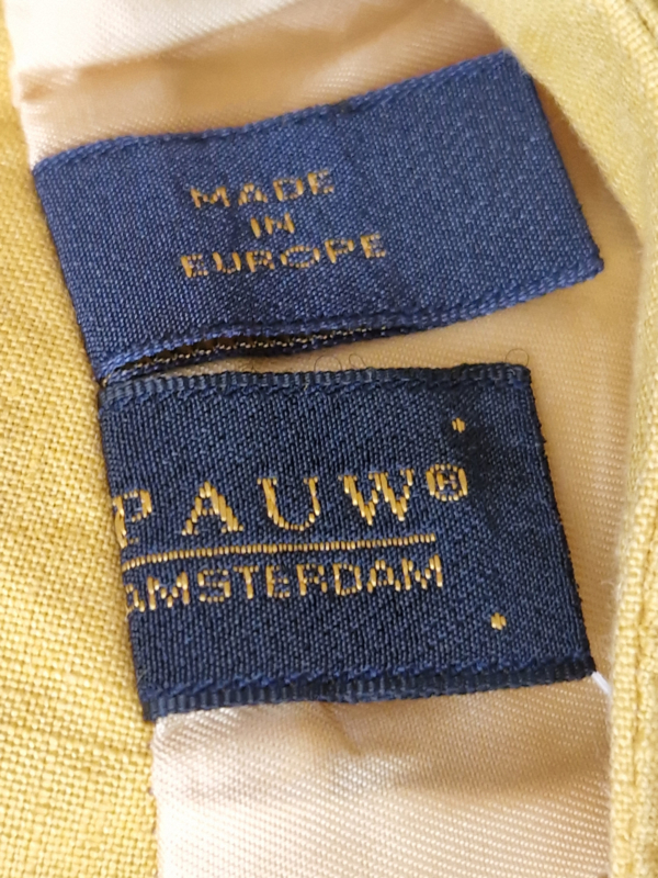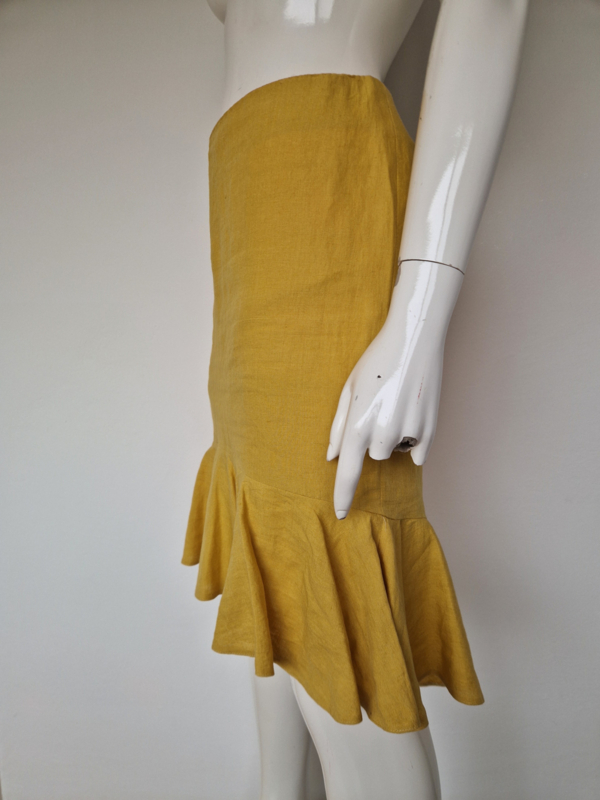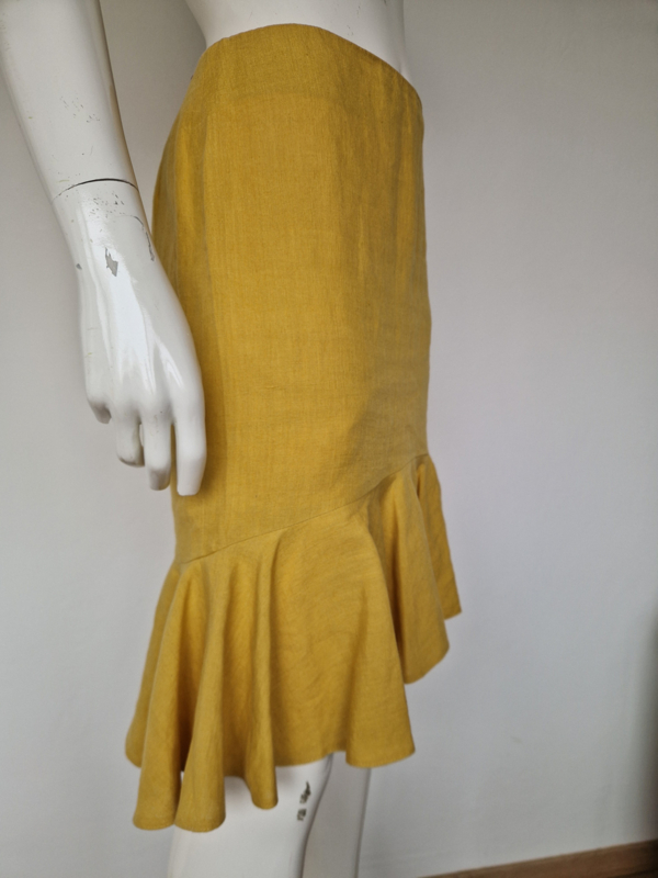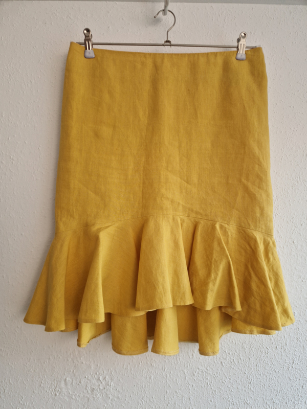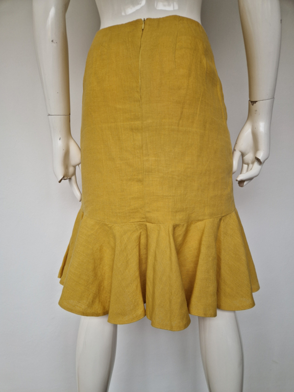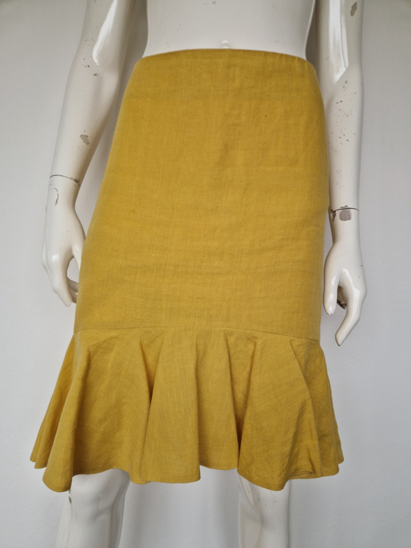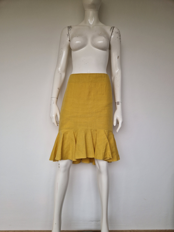 -Prachtige mosterdgele linnen rok met roezelstrook van Pauw in maat 3. De rok valt als een maat 38.