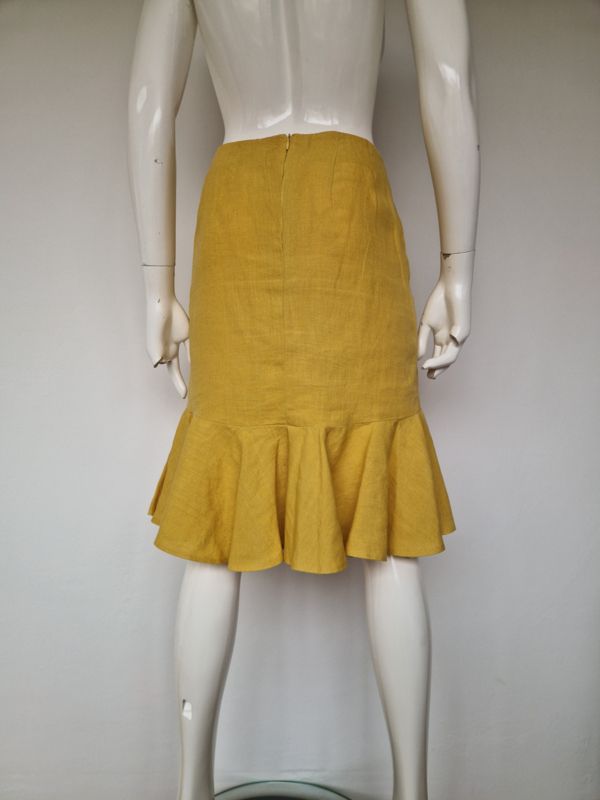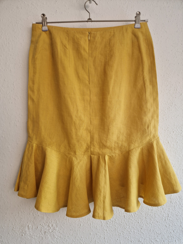 -Prachtige mosterdgele linnen rok met roezelstrook van Pauw in maat 3. De rok valt als een maat 38.