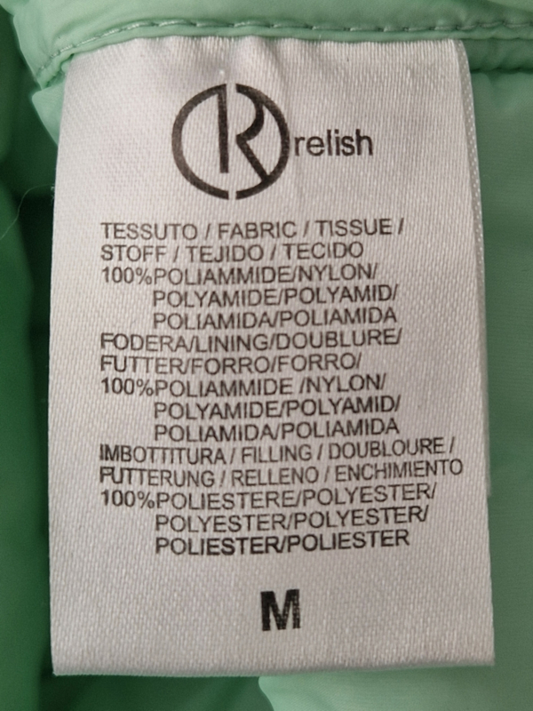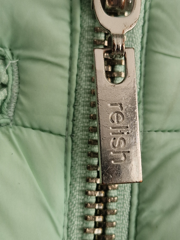 -Mooi mintgroen gewatteerde jas van Relish in maat XS. Er staat maat M in het label. Ik vind het jasje iets kleiner vallen.
