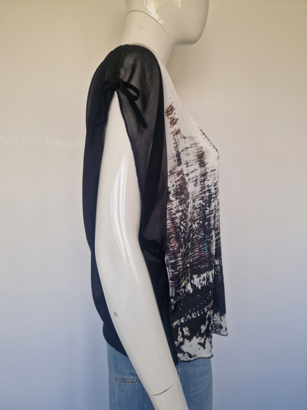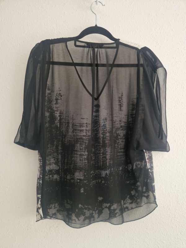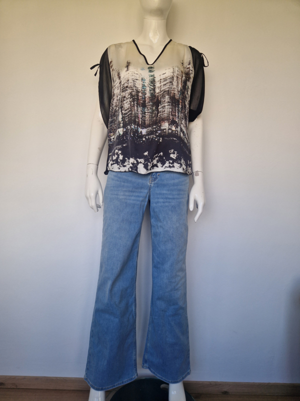 -Prachtige blouse met een bijzondere, artistieke print en elegante transparante mouwen van Summum in maat 36.