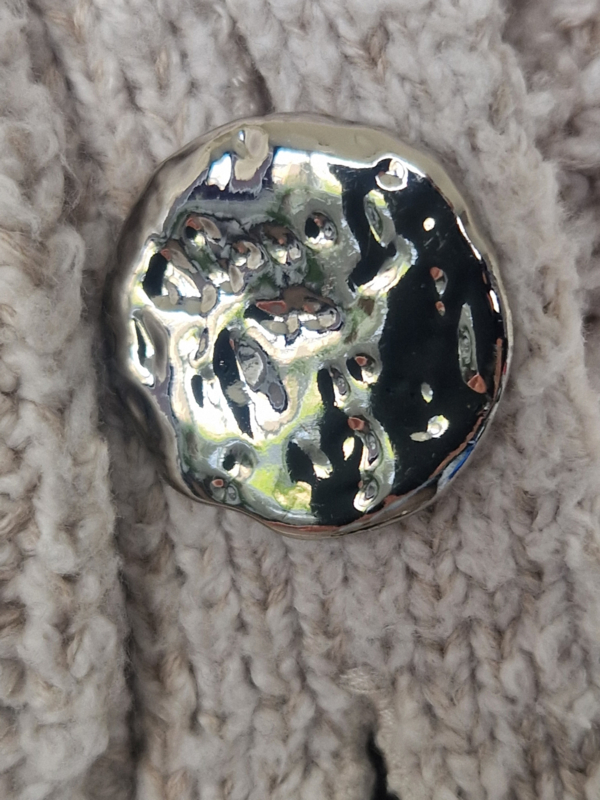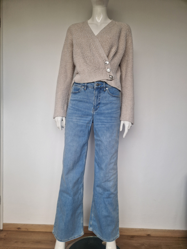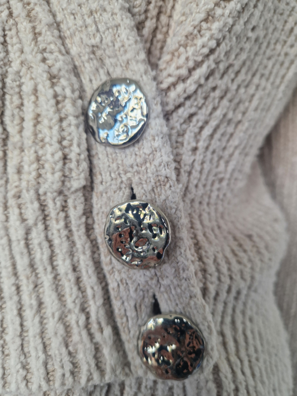 -Dit model (Gerda Knit Cardigan) heeft een elegante overslag met drie prachtige zilverkleurige knopen.