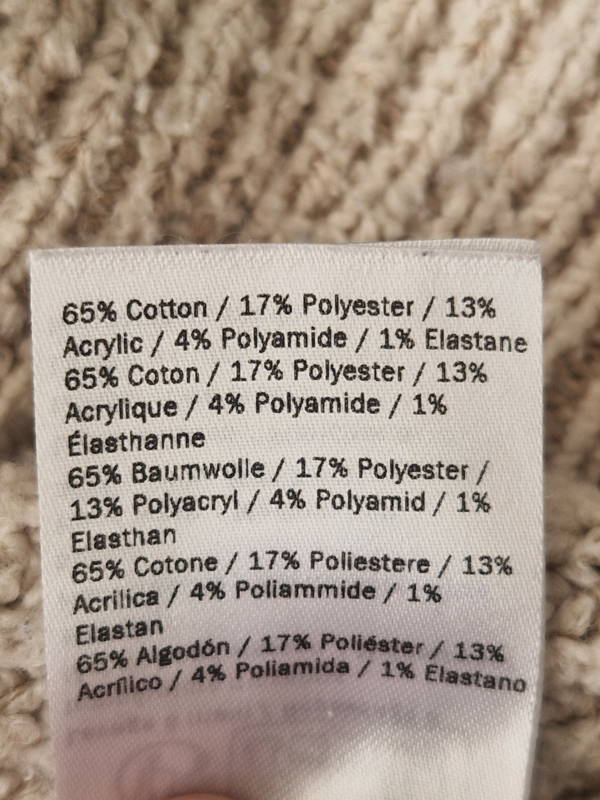 Materiaal: 65% katoen, 17% polyester, 13% acryl, 4% polyamide, 1% elastaan.