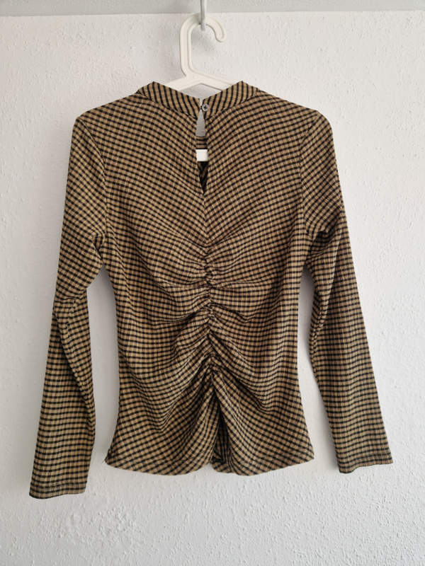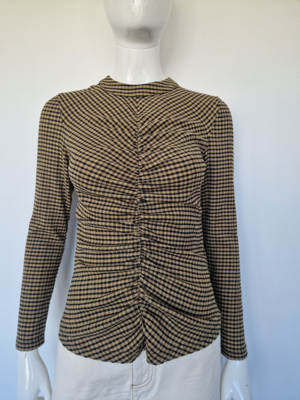 -De top heeft een elegante, aansluitende pasvorm met een gerimpeld (smock) detail aan de voor- en achterkant, wat zorgt voor een flatterend silhouet.