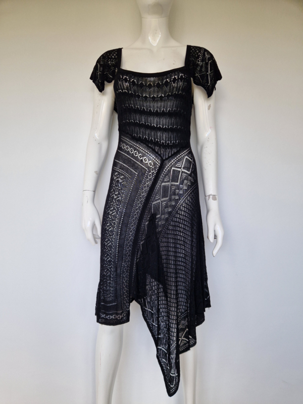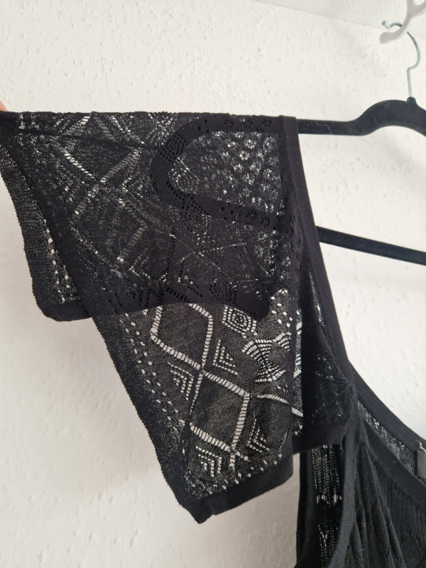 -Deze jurk is gemaakt van een opengewerkt (kant/mesh) materiaal met verschillende patronen, wat zorgt voor een speels en luxe effect.