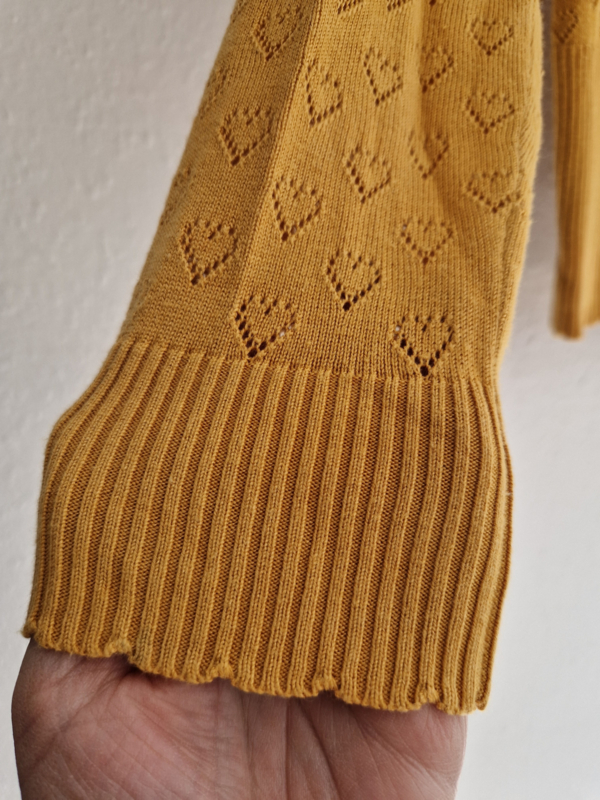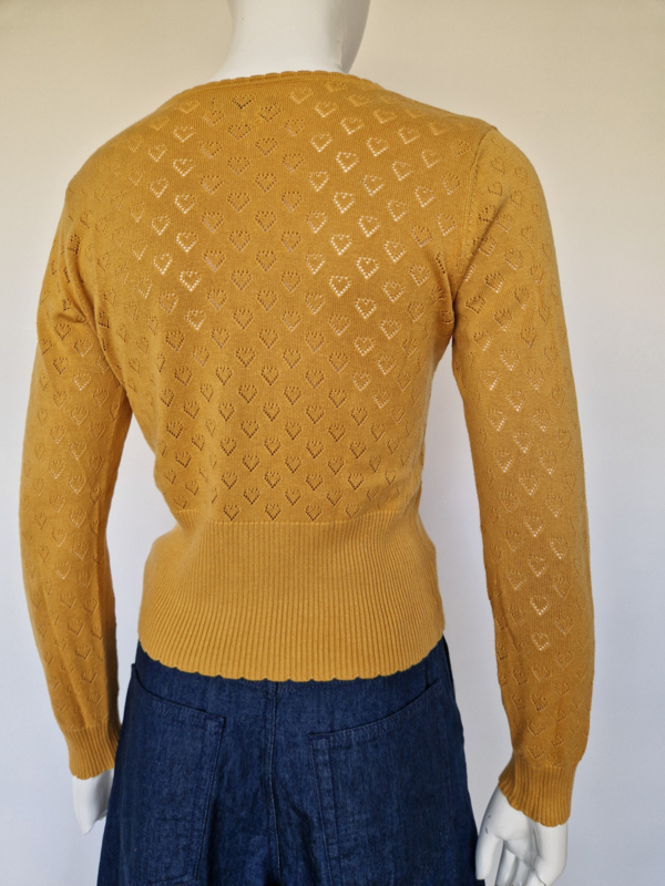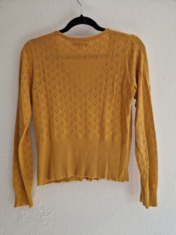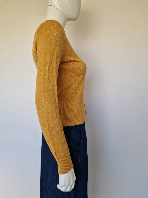 -Heerlijk zacht ajour gebreid vestje van King Louie in warme okergele kleur. Dit vestje valt mooi bij maat 38.