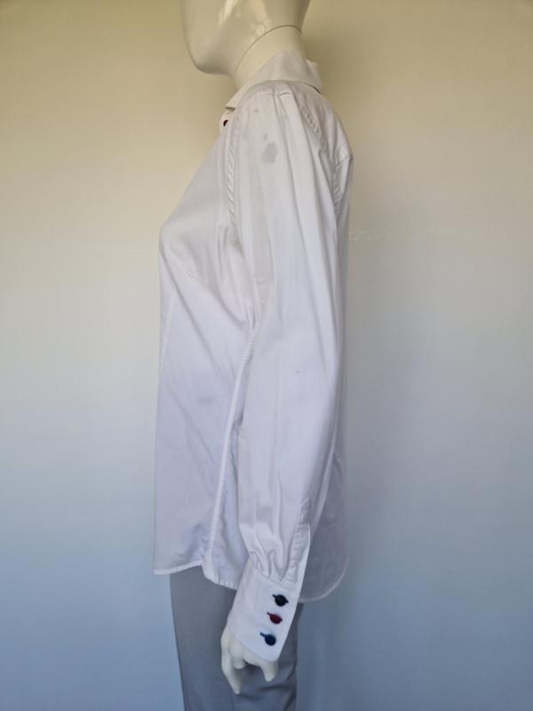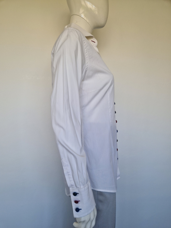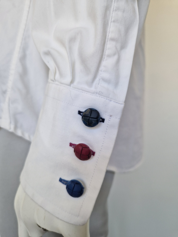 -Wat deze blouse bijzonder maakt zijn de speelse rood/blauwe knopen en subtiele details bij de manchetten.