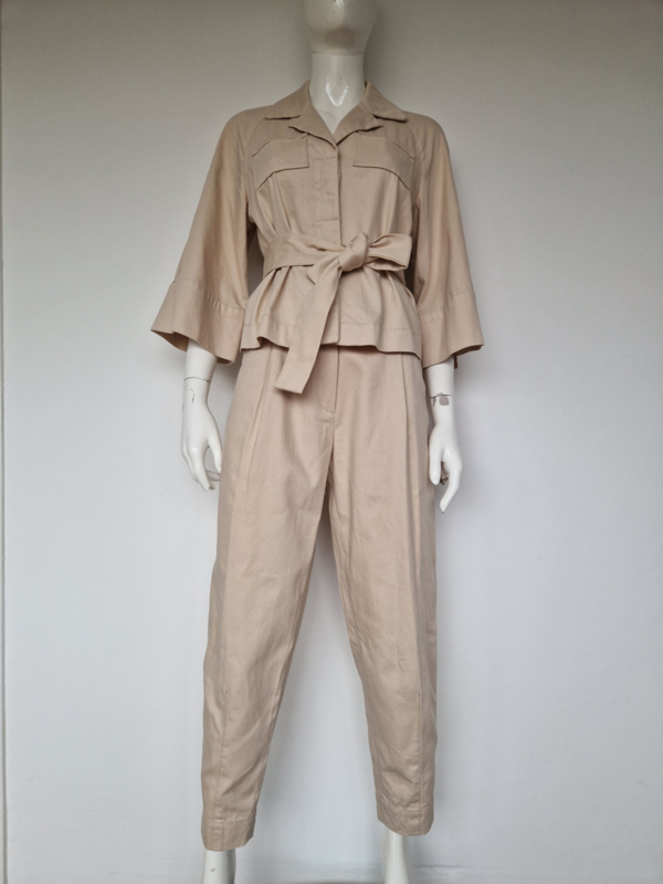 De blazer heeft een strikceintuur voor een getailleerd effect en de broek valt soepel en comfortabel. Winkelwaarde: 400 euro.