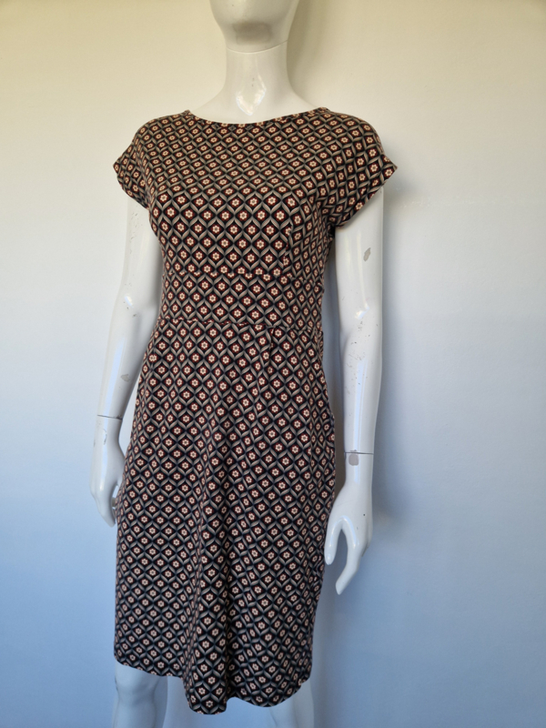 Status: zeer nette staat Materiaal: 95% viscose, 5% elastaan Lengte: 57 cm. Okselwijdte: 43 cm. Bijzonderheden: -Leuke blouse met een speelse retro print in groen, blauw en okergeel van King Louie in maat M. Deze blouse valt…